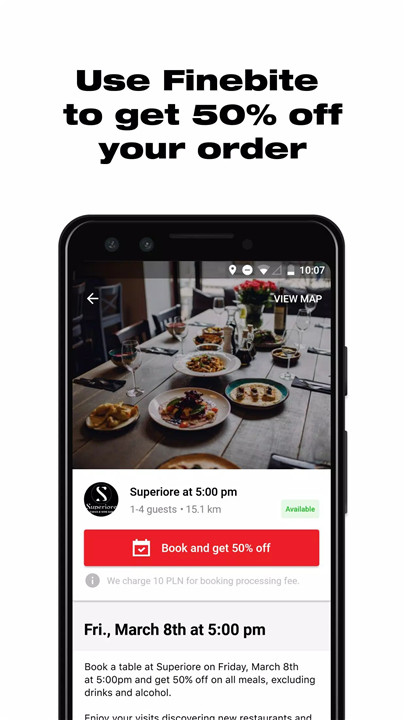 When you make a reservation using the Finebite app, you get 50% off all dishes from the menu during your visit. In exchange, you’re asked to complete a short survey about your dining experience, providing valuable feedback for the restaurant.