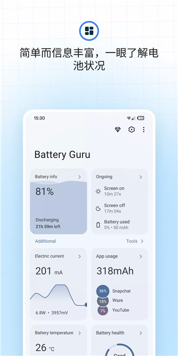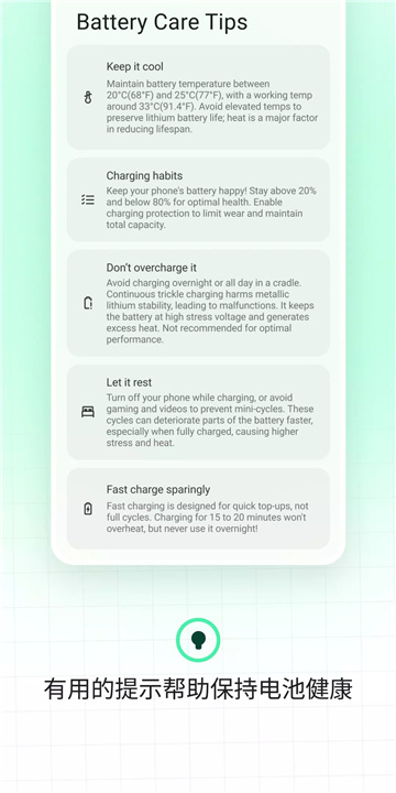 Battery Guru下载不仅是一款追踪工具,更是你深入了解电池的得力助手。通过应用内的详细说明与温馨提示,Battery Guru将为你揭示电池科学、硬件知识以及最佳充电习惯的秘密。