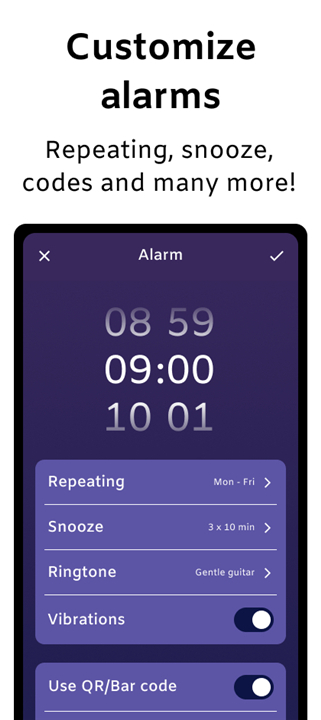 • QRAlarm PRO takes it a step further with advanced options that prevent you from disabling the alarm until you’re truly awake.