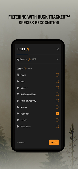 • Effortlessly sort and filter photos using species tags automatically generated by BUCK TRACKER™ AI technology.