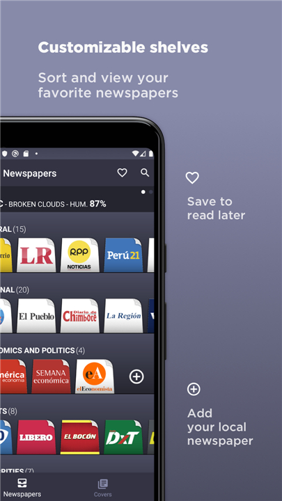 • Personalized Shelves: Add and organize newspapers to your custom wish shelves.