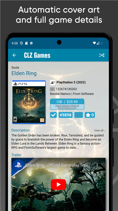 Our CLZ Core database automatically fetches cover art and comprehensive game information, including release dates, publishers, developers, descriptions, and even trailer videos. Plus, you’ll get daily updates on game pricing from PriceCharting!