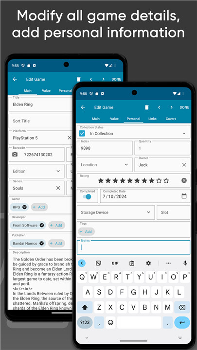 Feel free to modify any details provided by CLZ Core, such as titles, release dates, and publisher information. You can also upload your own cover art (both front and back) and add personal notes like completeness, condition, location, purchase date, price, and store.
