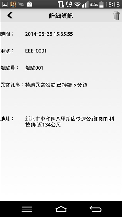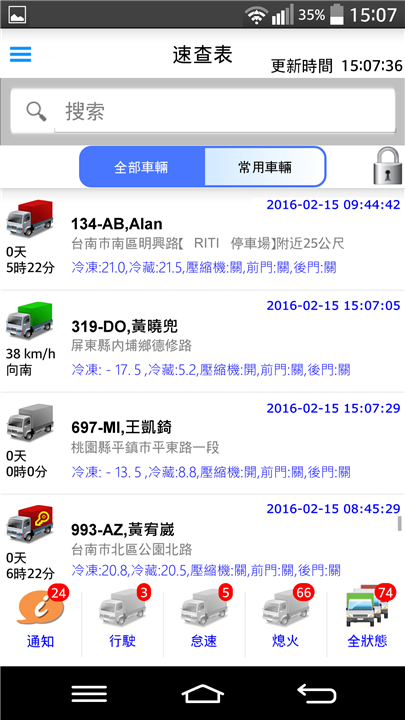 • Provides an instant overview of all vehicles’ current status, including location, speed, driver information, and communication details.
