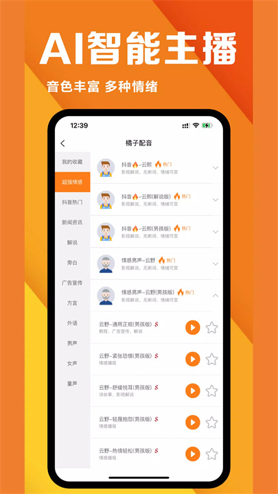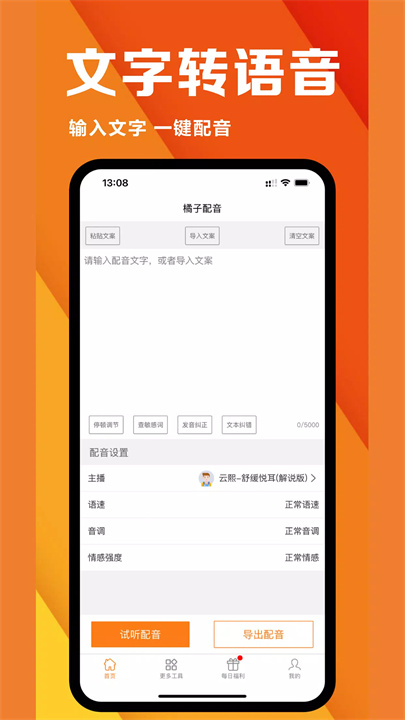 橘子配音是一款文字转语音配音软件,支持多种场景的配音需求,如短视频配音、游戏解说、广告配音等。