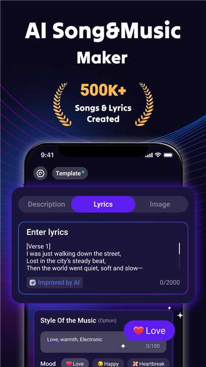 • Built-in lyrics generator for catchy hooks or dramatic ballads.