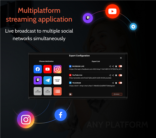 • Stream in up to UHD resolution to platforms like Facebook, YouTube, Instagram, Twitch, Telegram, or any RTMP/SRT‑enabled service.