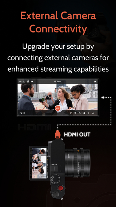 Connect your DSLR or External Camera via UVC Adapter directly to your smartphone and stream live to multiple platforms simultaneously with powerful compression and cellular bonding.
