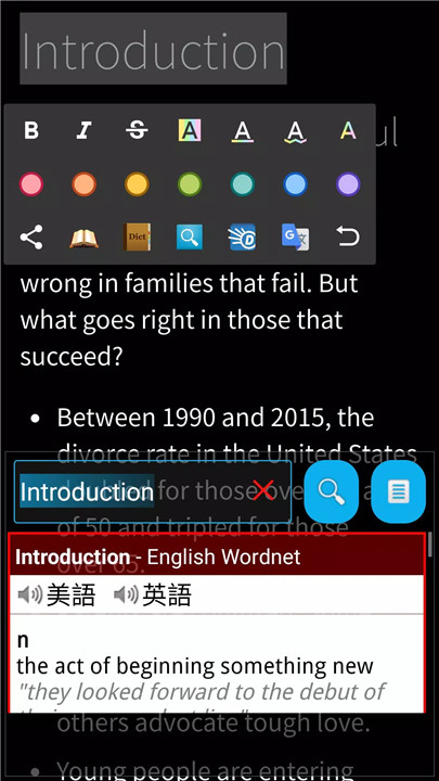 Highlighting and note-taking are effortless. Long-press to select text, choose styles (bold, strike-through, colored), or add notes using the chat bubble icon. Highlights and notes can be viewed in an organized list, with adjustable visibility by color. You can even scale note text with pinch-zoom.