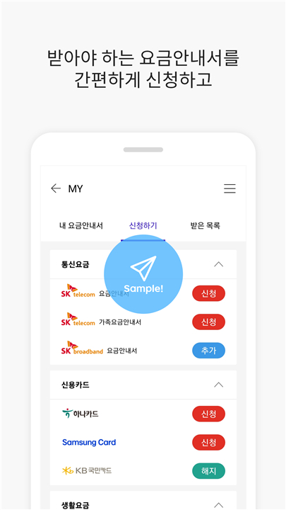 • Gather and manage bills from SK Telecom, SK Broadband, top credit cards (KB Kookmin, Samsung, Hana), Seoul City tax, city gas, and even cash receipt info.