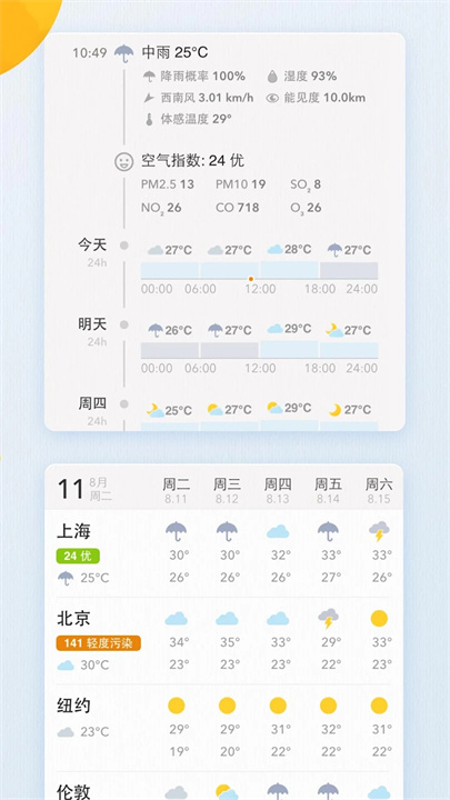 天气预报列表功能十分实用,亲友天气、世界城市同屏展示。