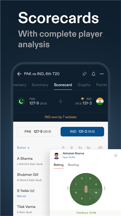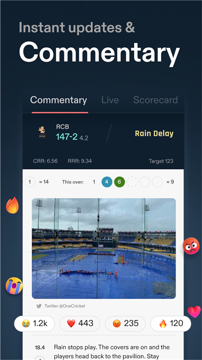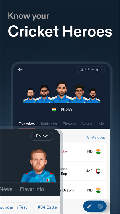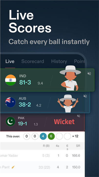• Experience the pulse of the match with the fastest ball-by-ball updates and detailed live scorecards.