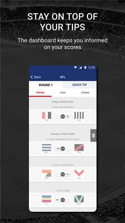 • For those who want to test their skills further, add Streak or Flexi competitions to your tipping pool.