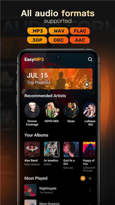 A: EasyMp3 is built for maximum compatibility. It can handle MP3, WAV, FLAC, AAC, 3GP, OGG, MIDI, and APE without compromising quality, so you won’t have to worry about reformatting your collection.