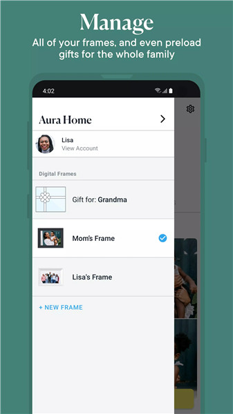 - Effortlessly connect the Aura Frames app to Aura smart digital photo frames for remote control.
