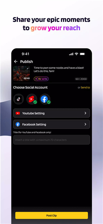 Manage your content distribution from one place. You can publish clips directly to TikTok, Instagram Reels, YouTube Shorts, or other platforms with a single tap, or schedule posts to maintain consistent engagement with your followers. Eklipse streamlines your entire content creation and sharing process.
