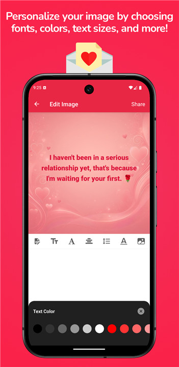 - You can quickly share your love declarations across popular social media platforms like WhatsApp, Facebook, Instagram, and more, ensuring your heartfelt words reach your loved one, no matter where they are.