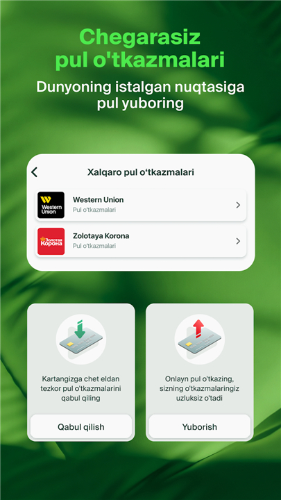 + Send money globally via Visa Direct, Western Union, Zolotaya Korona, and MoneyExpress.