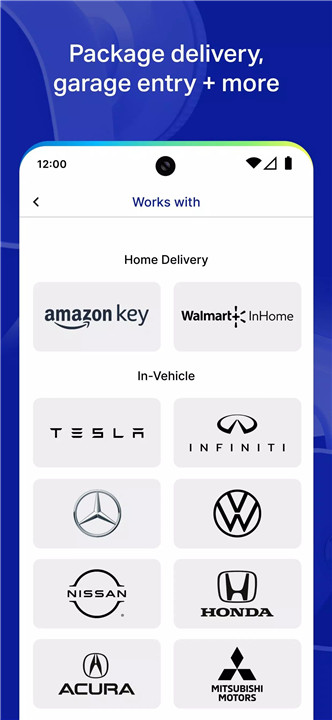 myQ Connected Garage allows you to use your vehicle's infotainment system to control your garage door remotely, no additional hardware required. Available in select Tesla, Honda, Acura, Volkswagen, Mercedes, and Mitsubishi vehicles, it integrates seamlessly with your car’s technology, giving you even more ways to manage your garage door.