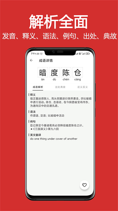 《成语词典大全》是一款专为成语学习者设计的全面工具,旨在帮助用户深入理解和掌握成语知识。该应用收录了56000条成语,涵盖拼音、释义、用法、例句、出处、典故及英文翻译等详细信息。用户可以按需选择中小学考试词库,自由制定学习计划,确保每天都能有效提升词汇量。