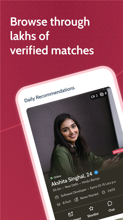 A: The app uses a smart matchmaking algorithm that takes into account your preferences such as community, religion, education, profession, and lifestyle. Based on this, it suggests profiles that are most likely to be compatible with you, making your search much easier.