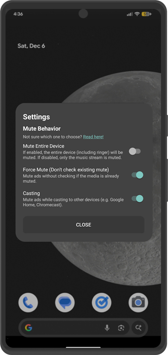 • Whether you use AccuRadio, Spotify, SoundCloud, Pandora, or virtually any other audio/video app, Ad-silence can detect and silence unwanted interruptions.