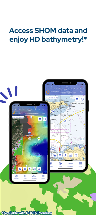 A: DONIA provides detailed seabed maps showing sand, seagrass, coral, and rock formations. Premium subscribers gain access to SHOM nautical charts and over 230 HD bathymetric maps, revealing underwater ridges, dive sites, and hidden formations in remarkable detail.