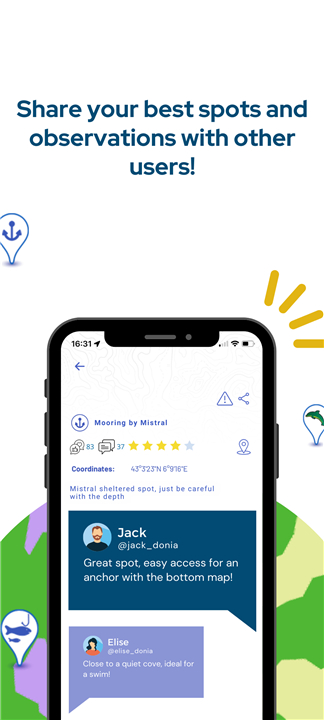 • Report anchor spots, marine wildlife sightings, and obstacles