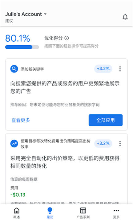 谷歌广告让您随时都能深入掌控广告系列状况。不仅如此,您还将有机会接触到众多高效建议,这些建议将有助于提升广告效果,让您能够迅速而准确地采取相应行动。