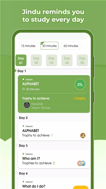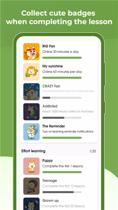 The app encourages daily study, aiming to foster a habit of consistent learning over a two-month period. Users are motivated to engage with the app regularly through the prospect of earning badges and progressing in their Korean language journey.