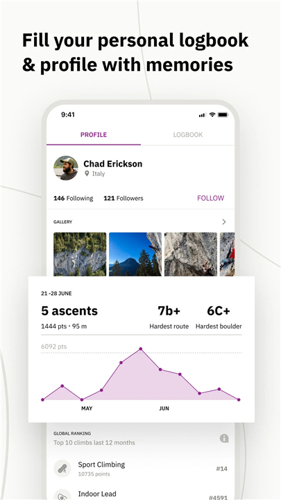 • Log your climbs, relive your best moments, and fuel your passion for the next adventure.