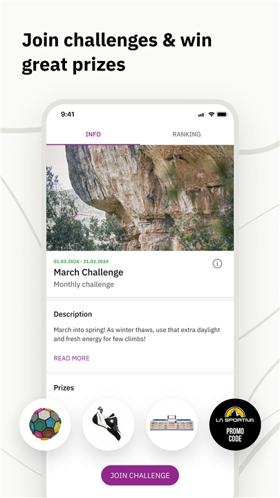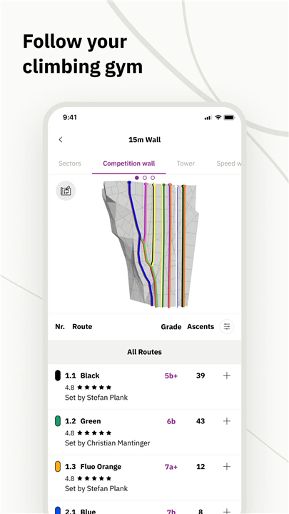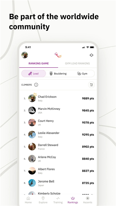 • Join a worldwide network—share sends, cheer on peers, and team up for gym events.