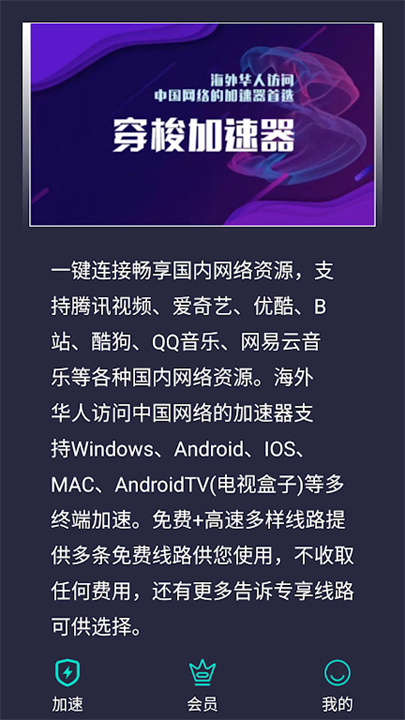 穿梭VPN是一款专为海外华人设计的加速器,轻松一键连接国内网络。让用户随时访问国内热门应用,如B站、优酷、QQ音乐、网易云音乐等,不受地域限制。穿梭回国VPN让你畅享高清视频、国服游戏和音乐,提供流畅、高速、稳定的网络体验,助你轻松回归国内网络世界。全球任意角落,国内资源随时享!