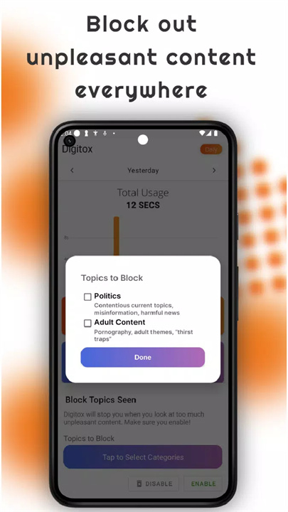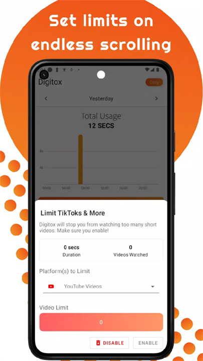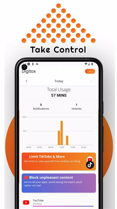 [数毒 Digitox]是一款帮助管理屏幕时间的应用,旨在帮助用户减少手机成瘾。通过设置自定义的使用限制,用户可以轻松控制TikTok、YouTube Shorts等短视频应用的观看时间,避免沉迷。除了设定视频观看时间,Digitox还提供屏蔽成人内容和分心信息的功能,帮助您保持专注。它提供简单易用的界面和高效的电池使用,确保您的生活更健康、更加高效。