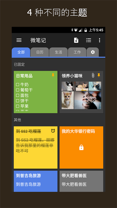 彩色笔记本:美观实用的彩色设计,让记录变得更有趣。多种主题色:提供多种漂亮的主题色,给你舒适的视觉体验。