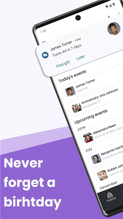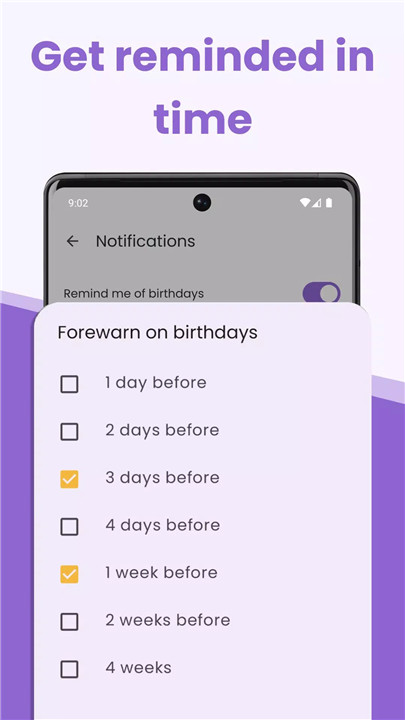 With the Birthday Calendar & Reminder app, you’ll receive timely notifications for all birthdays. Choose when to be reminded - whether it’s in the morning or when you return home in the evening. Enjoy peace of mind knowing you’ll never forget a loved one’s special day.