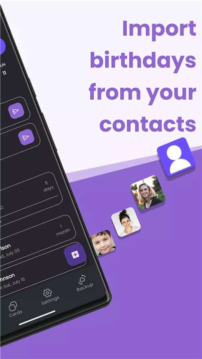Easily import friends and colleagues from your phone contacts or create entries manually. The app allows you to build a personal birthday list within seconds, ensuring you have all important dates at your fingertips.
