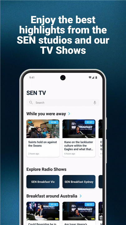 SEN Radio also brings fans closer to the action through video highlights and studio-based shows. Relive key plays, watch expert panel discussions, and get visual access to your favorite programs and personalities via the app or web platform.