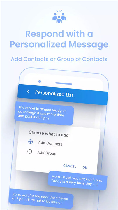 SMS Auto Reply/Autoresponder lets you tailor your auto-replies to specific contacts or groups of contacts. You can send personalized messages only to certain people while excluding others. This way, you can manage your communications more efficiently, ensuring that your important contacts get the attention they need.