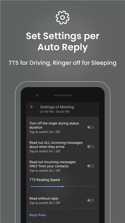 SMS Auto Reply/Autoresponder lets you set up different auto-replies for various situations. For instance, you can create one response for when you’re driving, another for when you're in a meeting, and one for when you're on vacation. You can easily customize each response, ensuring that you convey the right message for every scenario.