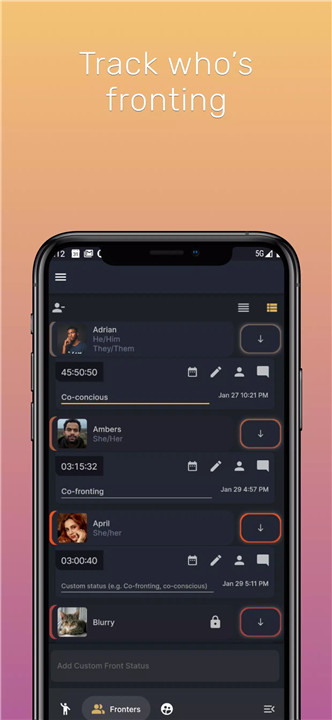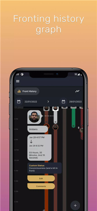 Simply Plural includes a visually engaging graph that tracks and displays the history of who has been fronting, offering a clear and organized view of fronting patterns over time.