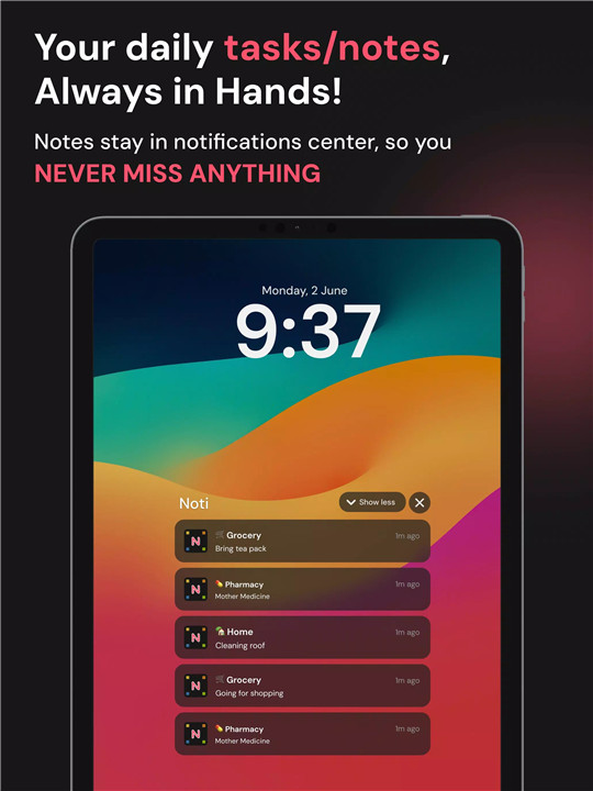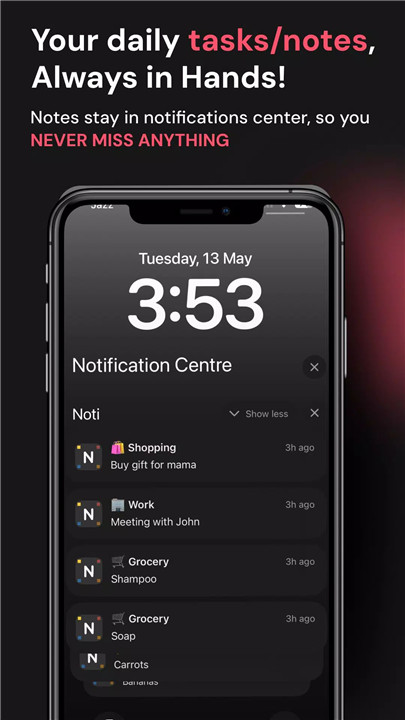Unlike most note or task apps, Noti lives in your notification center, giving you instant access to your lists and reminders—no unlocking required.