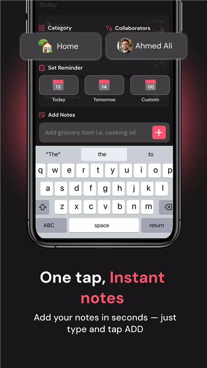 No more jumping through menus. Add a note or task in seconds with just one tap. Grocery items, chores, thoughts—just type and it appears in your notification center, ready to go.