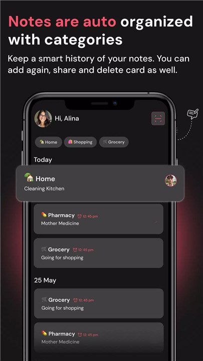 Easily share to-do lists with family or roommates using a QR scan or direct share. Get real-time updates when someone completes a task—like "Clean the dishes" or "Pick up groceries".