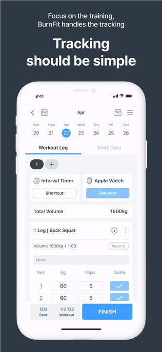 Yes, BurnFit automatically calculates one-repetition maximum (1RM), tracks workout intensity using RPE, and monitors progressive overload with training volume charts.