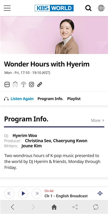• 24-hour audio streaming, including K-pop music and multilingual podcasts.
