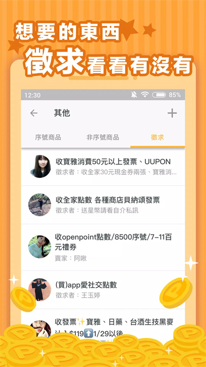 发布需求:发布你想要的虚拟商品(如贴图、游戏点数卡等),并与其他用户交换。