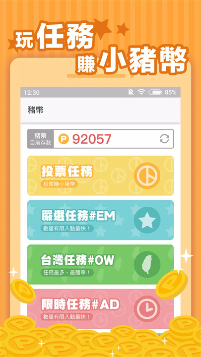 [小豬出任務]是一款通过完成任务获取奖励的APP。用户可以通过集点兑换、以卡换卡等方式,轻松获得贴图、游戏点数卡、现金礼券等各种福利。还可以在市集进行交易,省下生活开支,享受更多实用礼品。同时APP提供匿名论坛,帮助用户解答生活上的问题。下载后,轻松赚取奖励,贴图和点数卡任你拿!省钱省心,免费获得各种好礼!