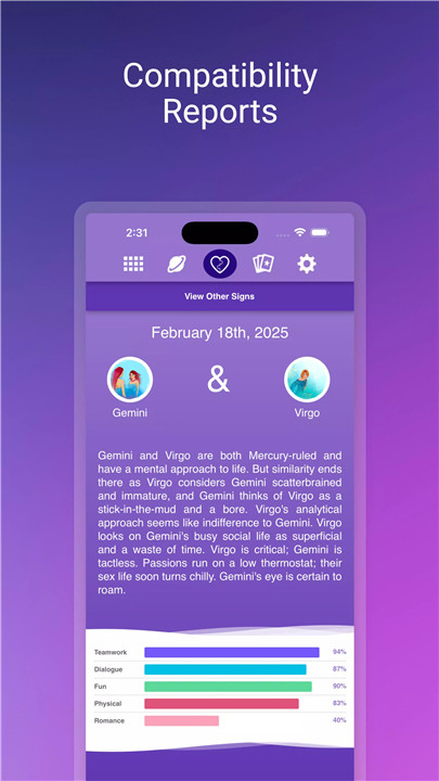 Wondering how well you match with someone? The Horoscopes app helps you understand your compatibility with other zodiac signs. Discover which signs align well with you and which ones might be more challenging, making it easier to navigate relationships, friendships, and even business partnerships.