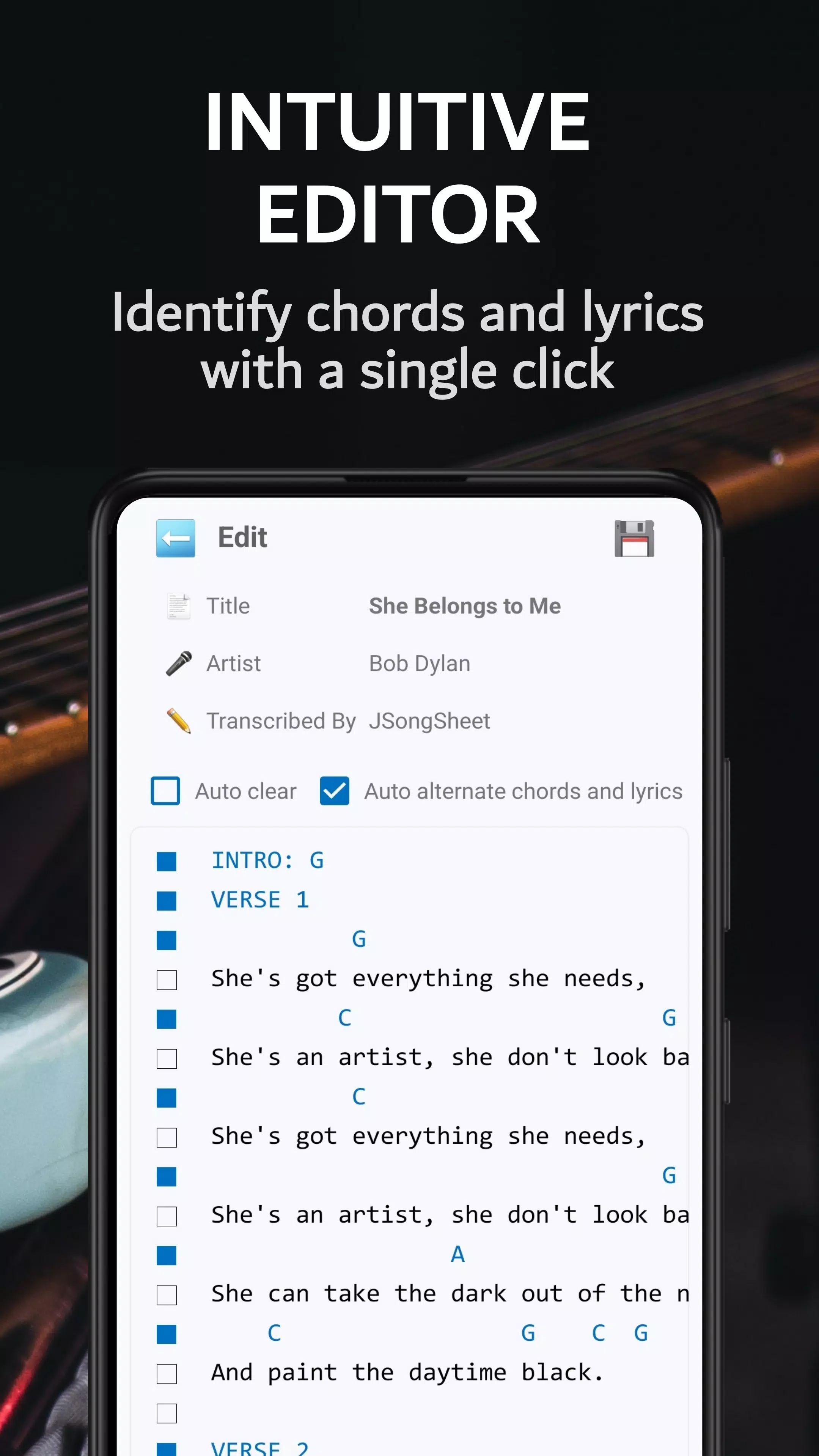 Use the built-in intuitive sheet editor to create or modify sheets with chords, lyrics, and notes.